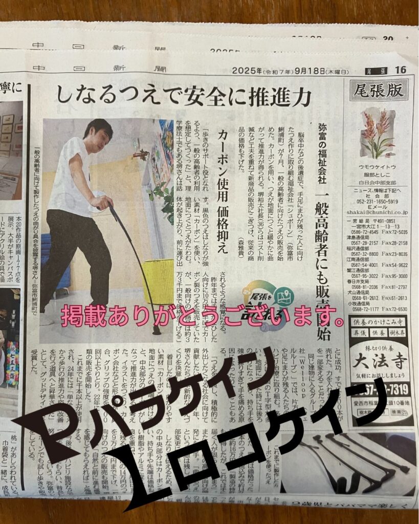 2025.09.18 【メディア】中日新聞にて紹介 2025年9月18日、中日新聞の尾張版にて「ロコケイン」「パラケイン」が取り上げられました。第三者の視点から弊社の取り組みをご紹介いただけたこと、大変光栄に思います。👉 記事はこちらをクリック